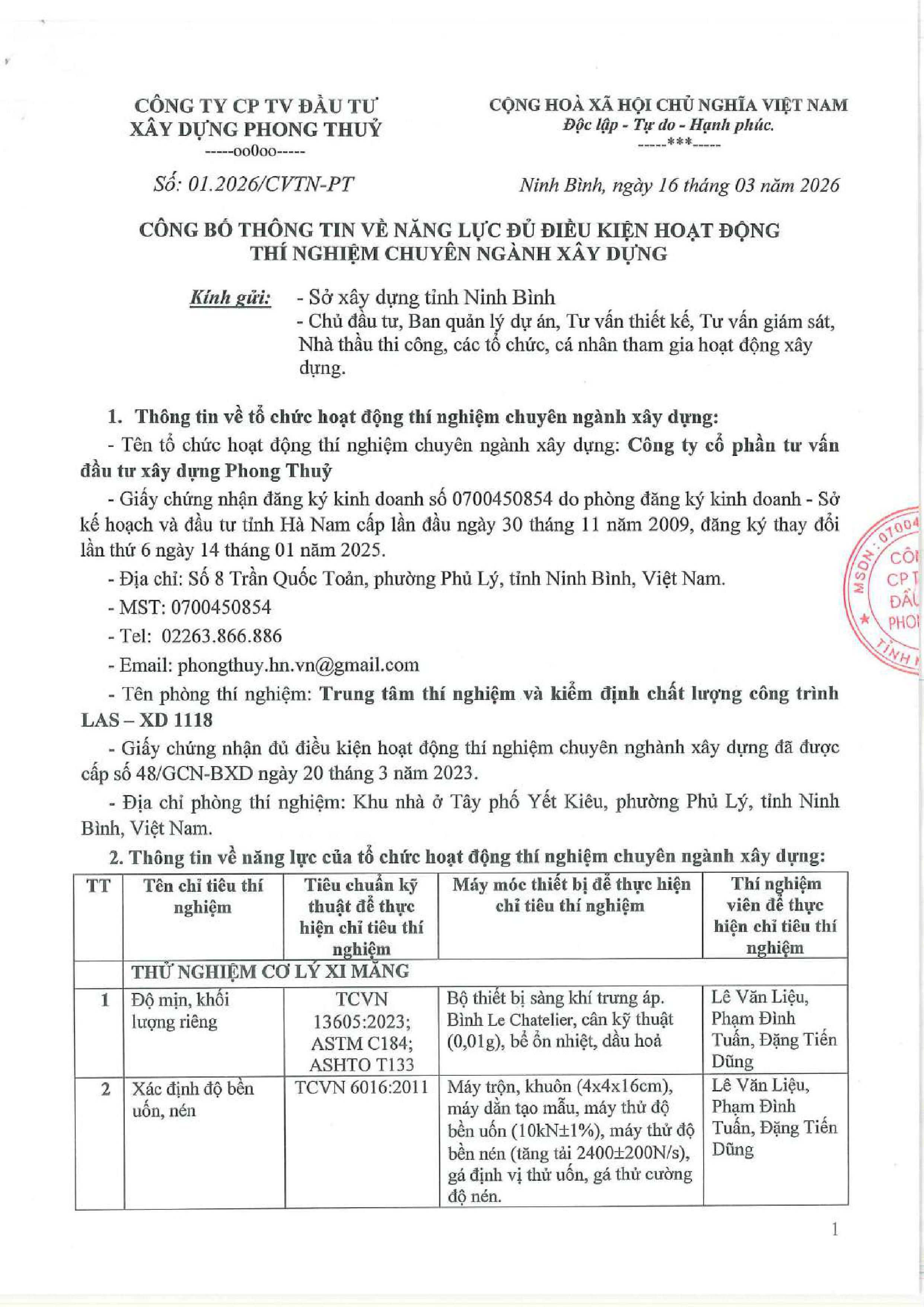 Phong Thuỷ sở hữu nhiều máy móc, thiết bị hiện đại với đội ngũ nhân viên chuyên nghiệp đáp ứng mọi yêu cầu thí nghiệm và kiểm định chất lượng các công trình xây dựng trên mọi miền của Tổ quốc. [ Xem tiếp >> ]